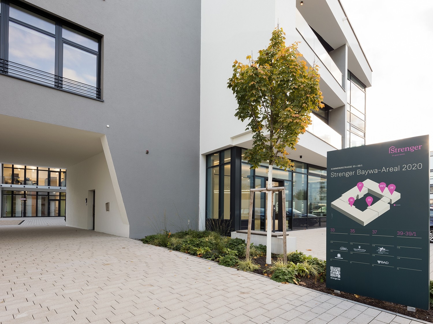 Wohnen, leben und arbeiten – topmodern verbunden: Nach Entwürfen des renommierten Stuttgarter Architektenbüros VON M entstand in der Ludwigsburger Weststadt das neue Stadtquartier BayWa-Areal Zwanzig Zwanzig. Der Name verknüpft die Historie des Geländes mit seiner Zukunft – dem Fertigstellungstermin. Auf dem ehemaligen Firmengrundstück der BayWa AG baute Strenger auf 6.800 Quadratmetern fünf moderne Häuser mit insgesamt 113 Wohnungen, die höchsten Komfort bieten. Das Herzstück des Quartiers bildet das zehnstöckige Wohngebäude, das an den einstigen BayWa-Siloturm und damit an die Geschichte des Grundstücks erinnert. Das Quartier besticht zudem durch viele kleine und große Extras für die Bewohner: zum Beispiel den Fitnessraum, sechs Ladestationen für E-Fahrzeuge direkt vor der Tür, eine Paketstation oder den Gemeinschaftsraum.