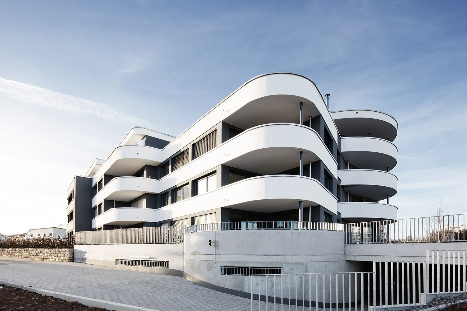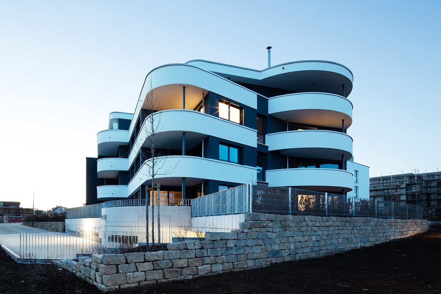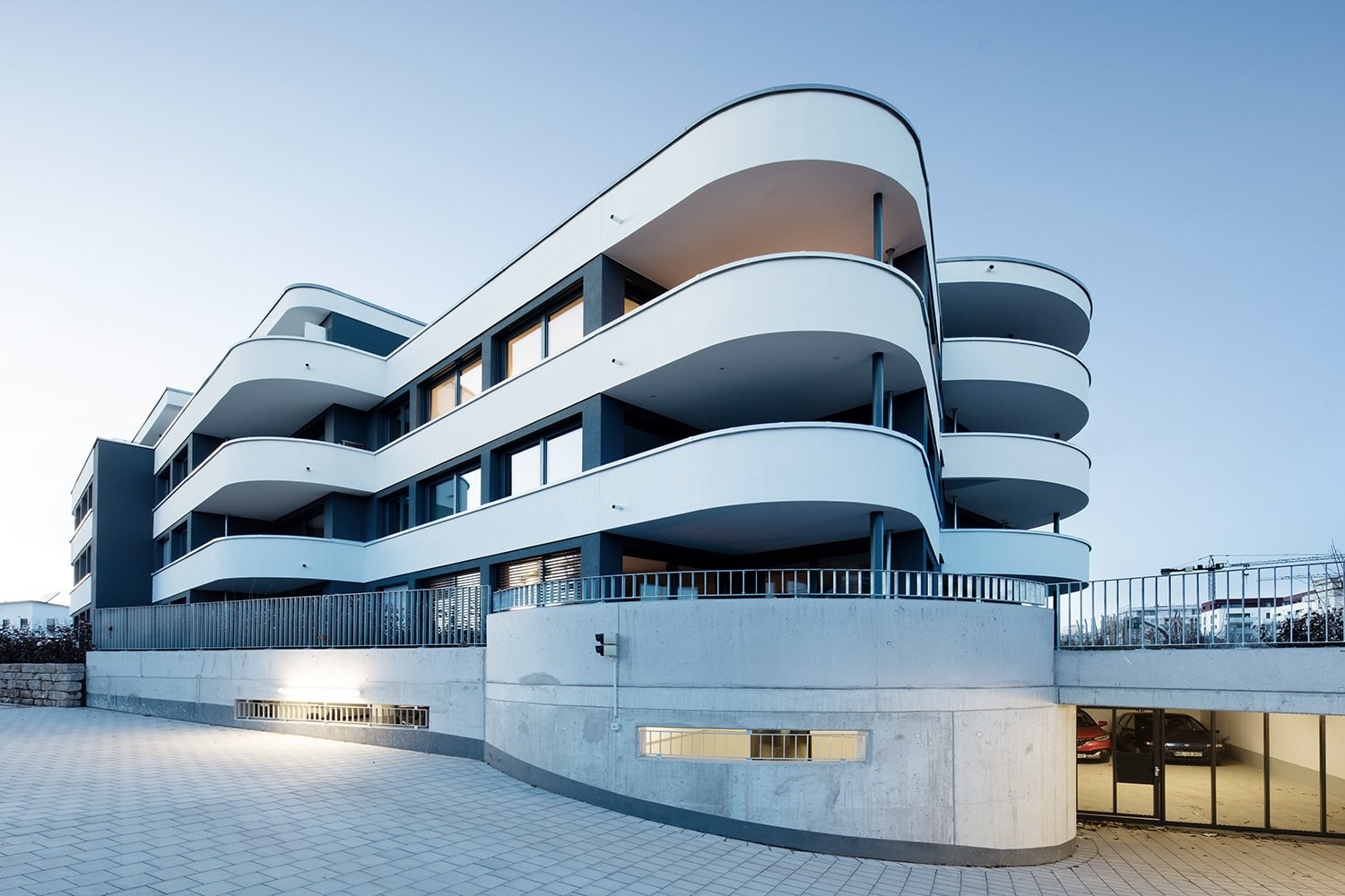 Das Smarthaus überzeugt aber nicht nur mit inneren Werten. Zuerst fällt die Architektur ins Auge: werthaltig, zeitlos und dadurch umso zukunftsfähiger. Sie zeichnet sich durch große Glasflächen und geschwungene Formen aus. Dank der Lage am leichten Südhang können die großen Sonnenbalkone und die Gärten im Erdgeschoss bestmöglich genutzt werden. Die 15 Wohnungen in KfW70 Bauweise verfügen über flexible Grundrisse für individuelle Wünsche, was die räumliche Ausrichtung betrifft. Großzügigkeit und Eleganz sind ein durchgängiger Wesenszug. Bei so vielen klugen Ideen ist es fast selbstverständlich, dass alle Wohnungen komfortabel und barrierefrei aus der Tiefgarage mit dem Aufzug erreichbar sind.