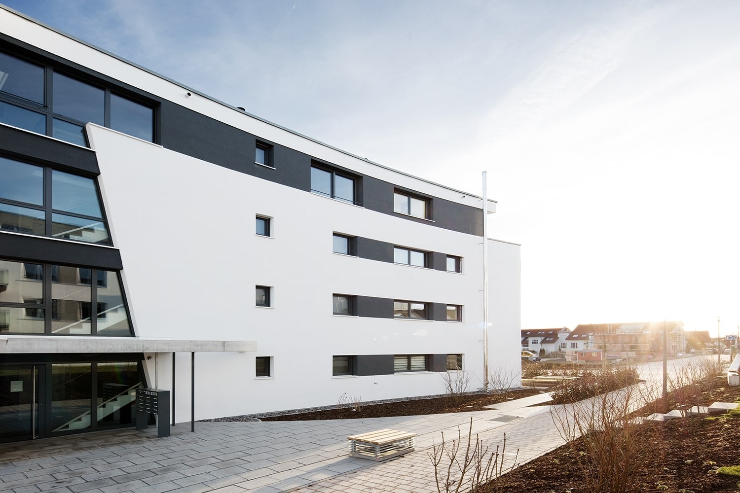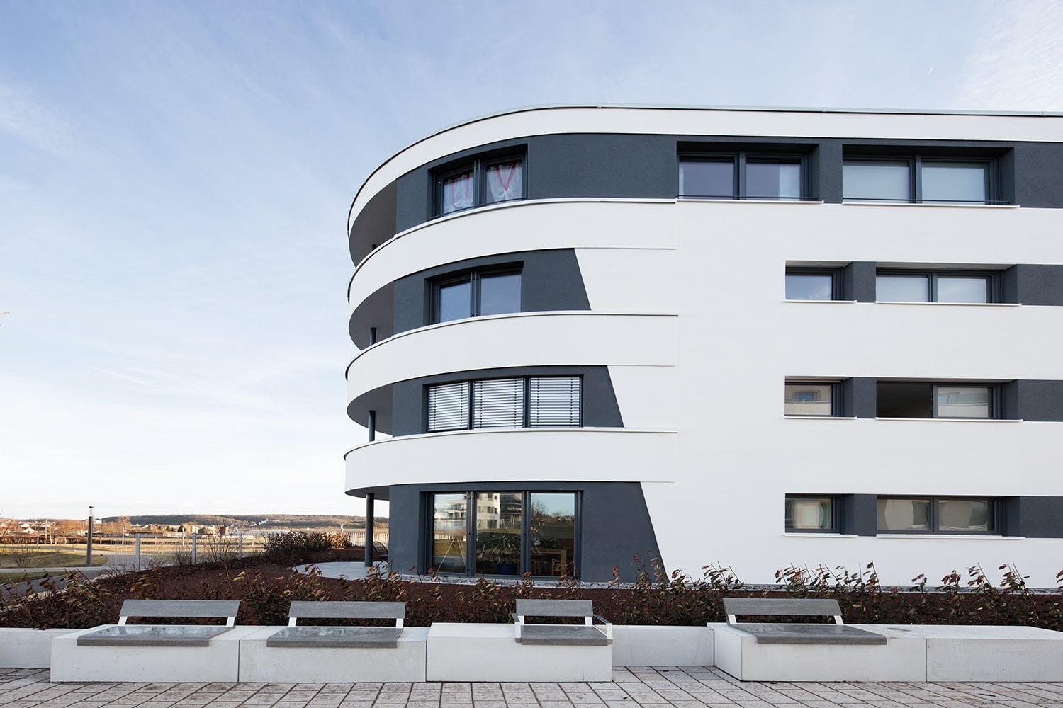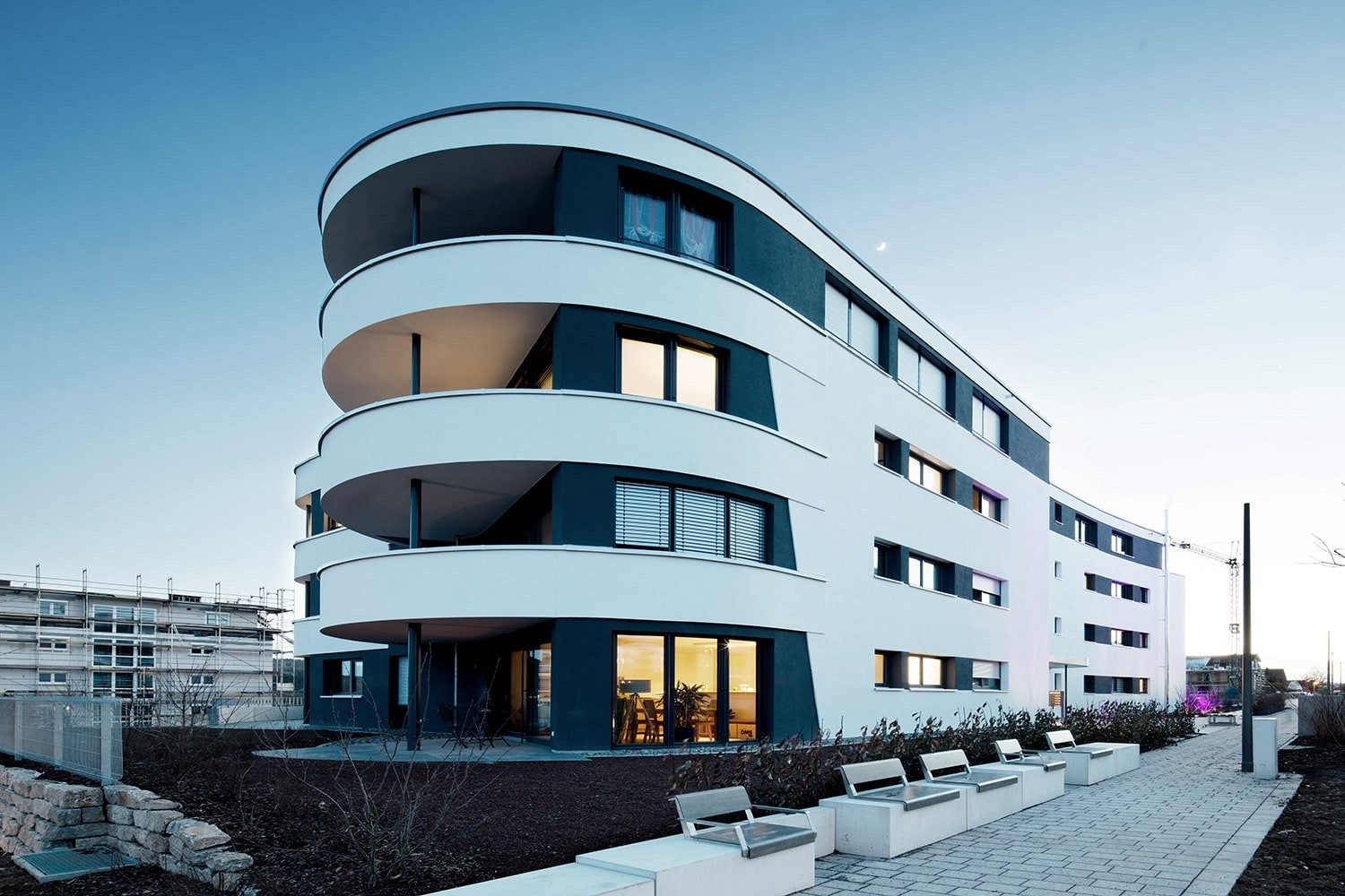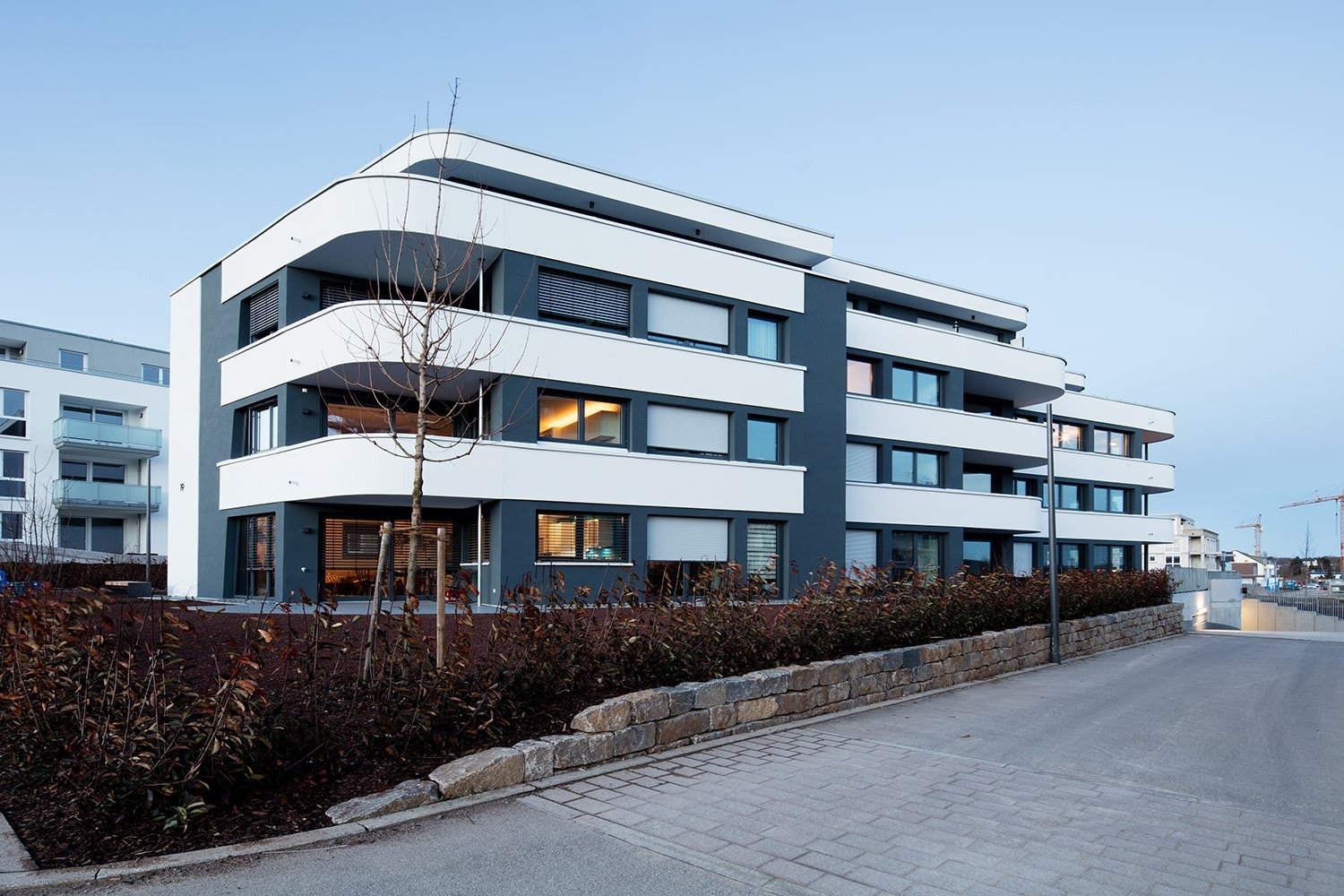 Das Smarthaus überzeugt aber nicht nur mit inneren Werten. Zuerst fällt die Architektur ins Auge: werthaltig, zeitlos und dadurch umso zukunftsfähiger. Sie zeichnet sich durch große Glasflächen und geschwungene Formen aus. Dank der Lage am leichten Südhang können die großen Sonnenbalkone und die Gärten im Erdgeschoss bestmöglich genutzt werden. Die 15 Wohnungen in KfW70 Bauweise verfügen über flexible Grundrisse für individuelle Wünsche, was die räumliche Ausrichtung betrifft. Großzügigkeit und Eleganz sind ein durchgängiger Wesenszug. Bei so vielen klugen Ideen ist es fast selbstverständlich, dass alle Wohnungen komfortabel und barrierefrei aus der Tiefgarage mit dem Aufzug erreichbar sind.