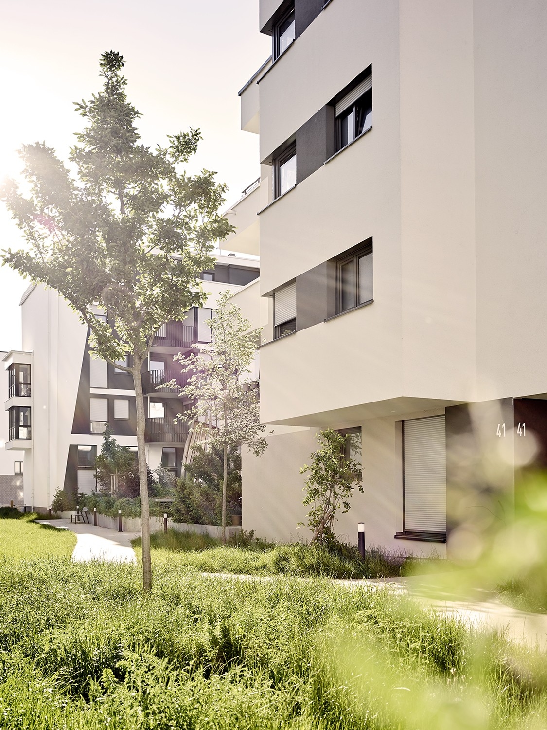 Hier treffen die gegensätzlichen Stilwelten zweier Architekten aufeinander: Klare Kanten und harte Linien verbinden sich mit geschwungenen, organischen Formen. Eine begrünte Fassade schafft eine Verbindung zwischen Architektur und Natur und ein moderner Innenhof bildet das Zentrum der Häusereinheit.